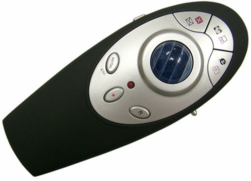 This Multimedia Wireless Presenter is a light-weight, handy and easy to use multi-function presenter with a 650nm red laser pointer and optical trackball mouse which allows 360 degree cursor control. The presenter is equipped with 2.4GHz advanced Radio Frequency (RF) technology which enables the user to move freely from up to 50 feet away without "line-of-sight" limitations. Excellent for executives, sales professionals, teachers, students, academics, training classes, orientation and much more. Make the best presentation without interruption or annoying delays. Dual function modes even enable you to open/close your email, internet browser, desktop, my computer, and other favorite programs with ease! Complies with CDRH and FDA regulations. FEATURES: 400 DPI Optical Trackball Mouse. Comfortable black matte leather-like grip. USB 2.0 (backward compatible with USB 1.1) connection w/ Plug and Play installation, no software driver required. Remote Page Controller allows access to PowerPoint, Word & PDF files from up to 50 feet away. No line-of-sight limitation. Three-Button Design for Email, Internet Browser, Desktop, My Computer, Favorite programs activation. Built-in 650nm Laser Pointer with 500 yard emission range. Operating Systems Supported: Windows 98, 98SE, ME, 2000, XP, Mac OS & Linux. FUNCTIONS: Mode 1 (M1): Email, Desktop, Internet Browser, Page-Up/Page-Down, Alt/Tab, Laser Pointer, Optical Trackball Mouse: Right/Left Buttons. Mode 2 (M2): Close, My Computer, Favorites (Internet Browser), Zoom-In/Zoom-Out (for Photos), ESC, Laser Pointer, Optical Trackball Mouse: Right/Left Buttons. Dimensions without batteries: Presenter - 4.92" x 2" x 1.85" - Weight: 1.94 oz. Receiver - 2.87" x 1.02" x 0.55" - Weight: 0.56 oz. Ships in handsome foam lined black gift box with included velvet carry pouch + USB extension cord and two AAA batteries; paked with equipment.